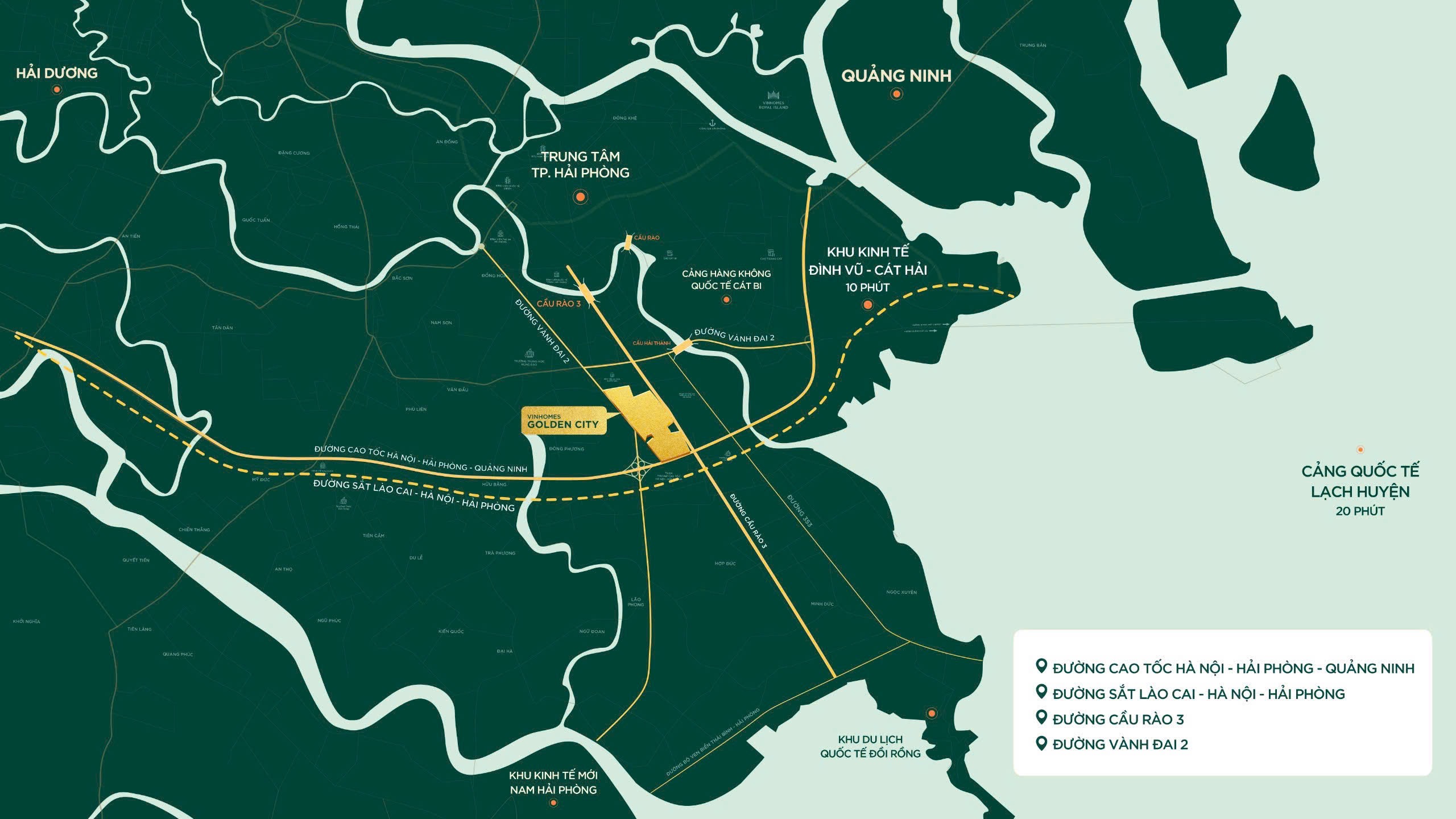 Vinhomes Golden City tọa lạc tại 2 Quận Dương kinh và Kiến thụy, Hải phòng là khu đô thị kiểu mẫu,kiến tạo nên một không gian sống tích hợp “All in one” tại TP Hải phòng tiếp theo. Tại đây là sự tiếp nối những thành công của thương hiệu Vinhomes, là điểm dừng an cư lý tưởng cho cư dân, nơi đầu tư sinh lời hiệu quả cho giới địa ốc miền bắc.